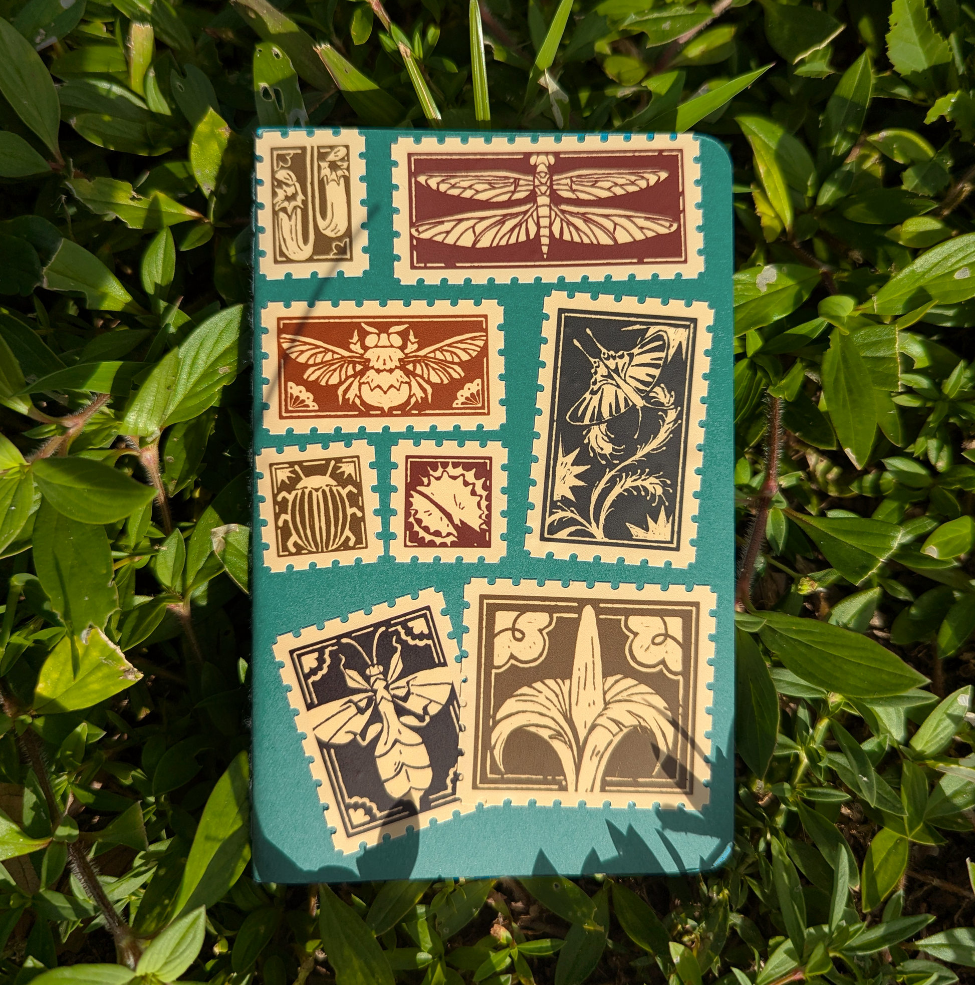 A 6" x 4" matte vinyl sticker sheet of multiple bugs partying with possibly threatening plants for you to stick onto your favorite places, each made with a stamp pattern.